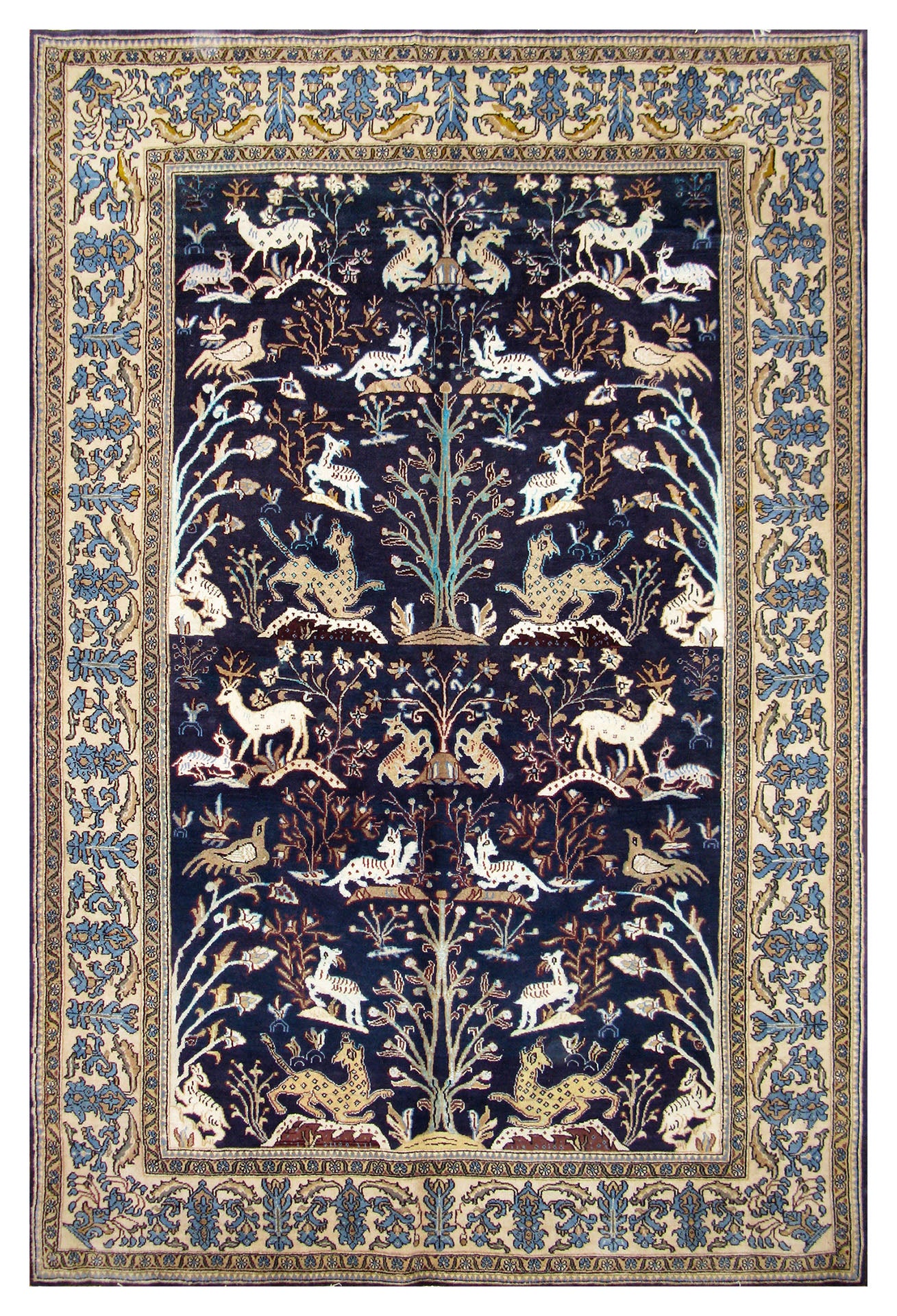 Qum rugs are among the finest rugs in the world. The quality of Qum silk rugs is particularly high. In the past and at present, Qum is one of the most important centres for producing silk, Kourk wool and silk inlaid carpets. Weavers in Qum use Persian knots and average around 600 knots per square inch. The majority are small, very fine, and beautiful; so many people hang them on the wall. The patterns are usually highly curvilinear, but they sometimes illustrate landscape features or historical stories. Qum is located in central IRAN, about 100 km south of Tehran, near Dasht-e-Kavir, a large salt desert to the east.